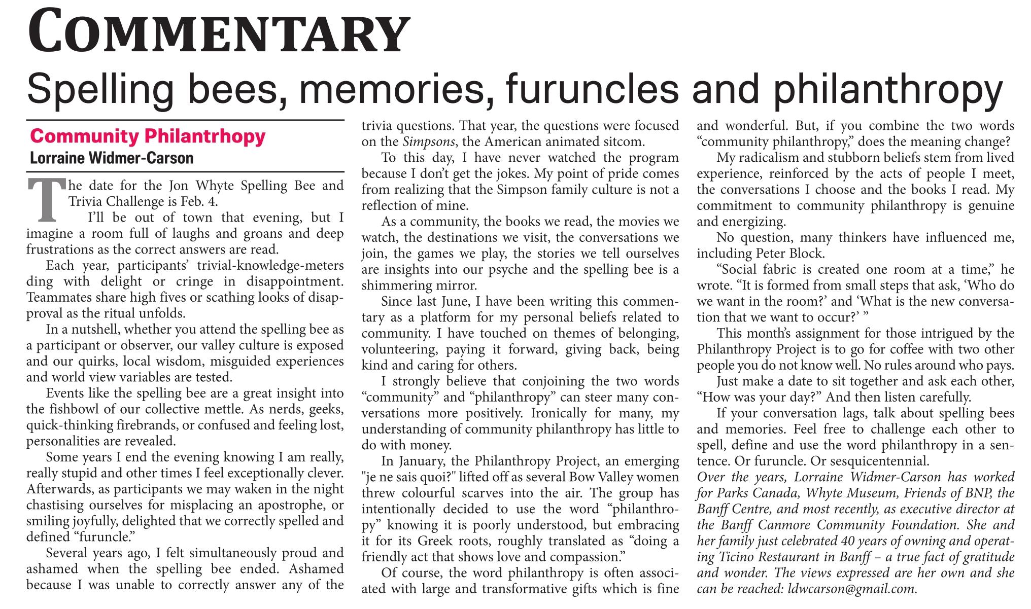 Spelling Bees, memories, furuncles and philanthropy – as published in Rocky Mountain Outlook, February 6, 2020