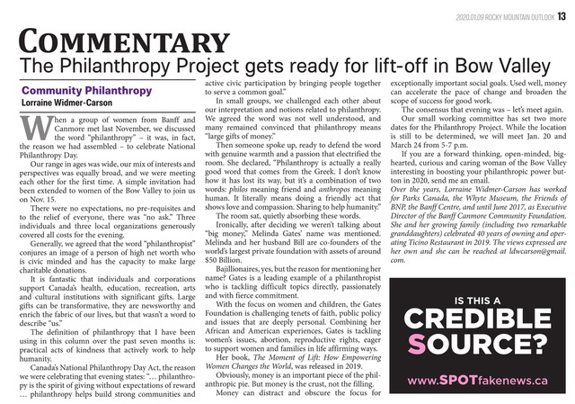 When a group of women from Banff and Canmore met last November, we discussed the word “philanthropy”. It was the reason we had assembled, to celebrate National Philanthropy Day.